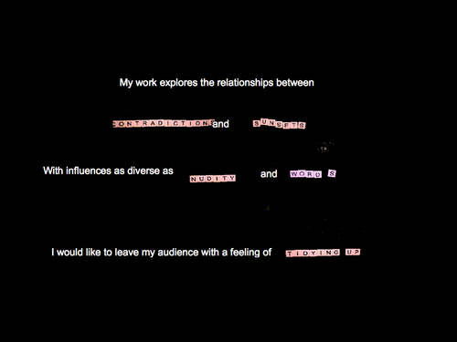 The words are constantly being scrambled by chance, at times forming a nonsensical text. This echoes the deconstructive and playful strategies the Dadaists implemented with language as a way to free it from meaning. The result is a collective portrait of those that participated, constantly in flux.